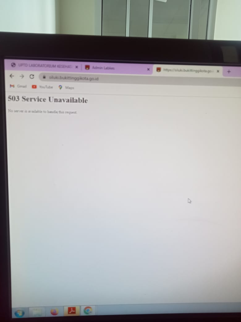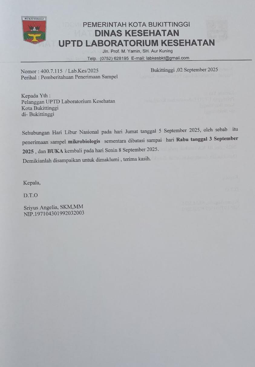 Kepada Bapak/Ibu PelangganYth: Bersama ini diberitahukan terjadi gangguan pada Website Siluki. Gangguan menyebabkan Website tidak bisa diakses untuk sementara waktu. yang berdampak pada saat registrasi sampel dan akses Laporan Hasil Pemeriksaan.